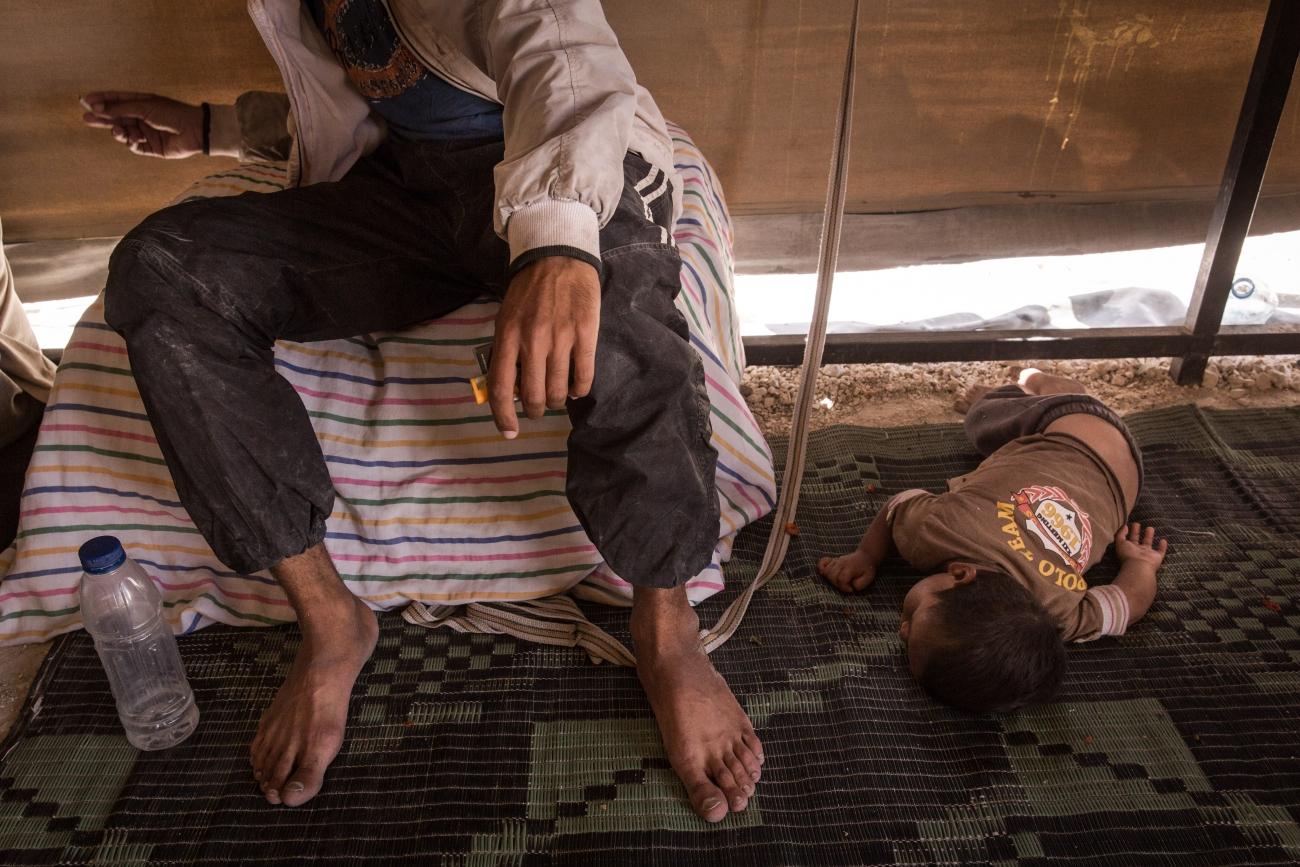 Un jeune enfant fait une sieste en pleine journée. La température atteint souvent 45°C et une épaisse poussière obstrue l’air. Compte tenu de la chaleur, les activités sont réduites au minimum.
