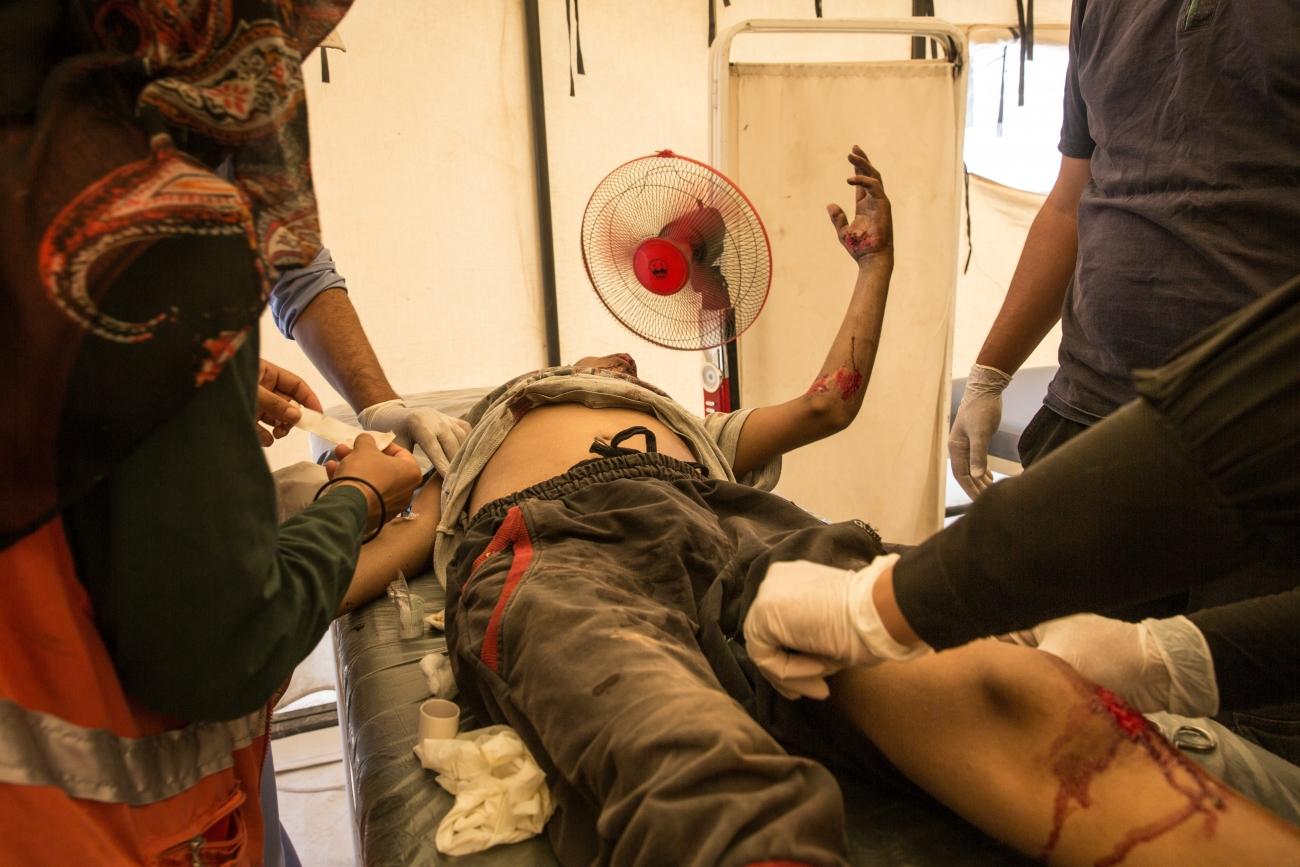 La présence de MSF à l’intérieur du camp permet de stabiliser les blessés. Ce Syrien originaire de Rakka a eu un accident de mobylette. Les médecins interviennent rapidement et peuvent, en cas de besoin, transférer les patients à l’hôpital de Kobané où MSF est également présente.