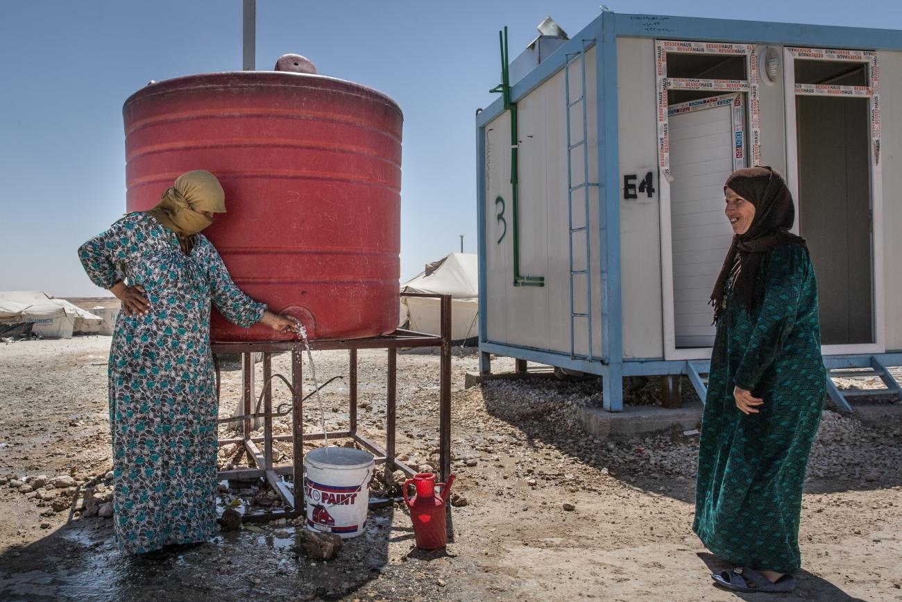 Deux femmes prennent de l'eau à l'un des points de distribution.