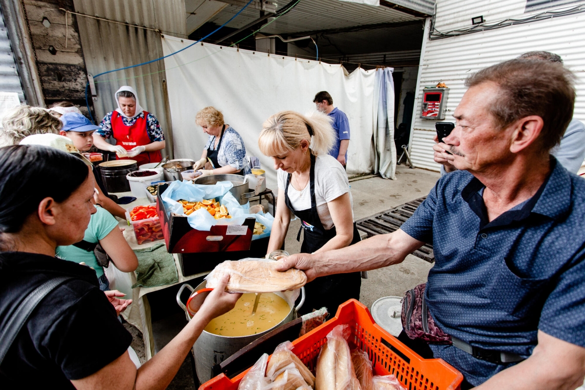 « Après avoir entendu les premières explosions, je suis allé à l'épicerie pour acheter de la nourriture pour ma famille. Quand j'ai vu la longue file d’attente pour acheter de l'eau potable, je me suis rendu compte qu'il n'y en aurait pas assez pour tout le monde, raconte Dmitry Zakharov. Alors, j'ai commencé à réfléchir à ce que je pouvais faire pour aider ». Dmitry a vite trouvé comment dépanner les gens : possédant sa propre réserve d'eau potable dans son restaurant, il a distribué gratuitement des bidons d’eau. Son activité professionnelle est passée au second plan et son restaurant est devenu une sorte de dispensaire où sont délivrés des soins gratuits. Lorsque les conditions sécuritaires le permettent, un médecin et un psychologue MSF offrent leurs services dans la salle à manger, tandis que des infirmières bénévoles perfusent des patients atteints de cancer dans une pièce adjacente. Et des bénévoles préparent des repas pour environ 1 200 personnes chaque jour dans la cuisine.