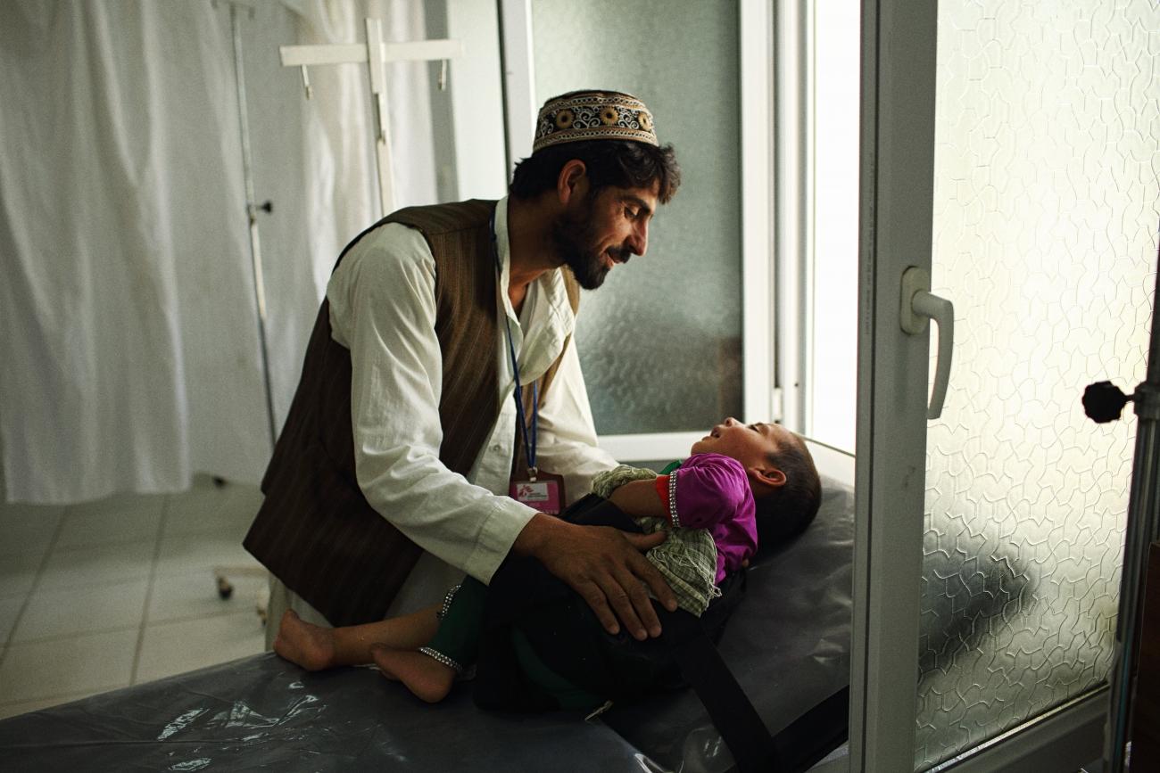 Qudus, avec sa fille de quatre ans, Khal Bibi, blessé aux jambes après être tombée du toit de leur maison. Le centre de traumatologie de MSF était le seul centre de ce type dans toute la région du nord-est de l’Afghanistan. Il avait ouvert en août 2011.