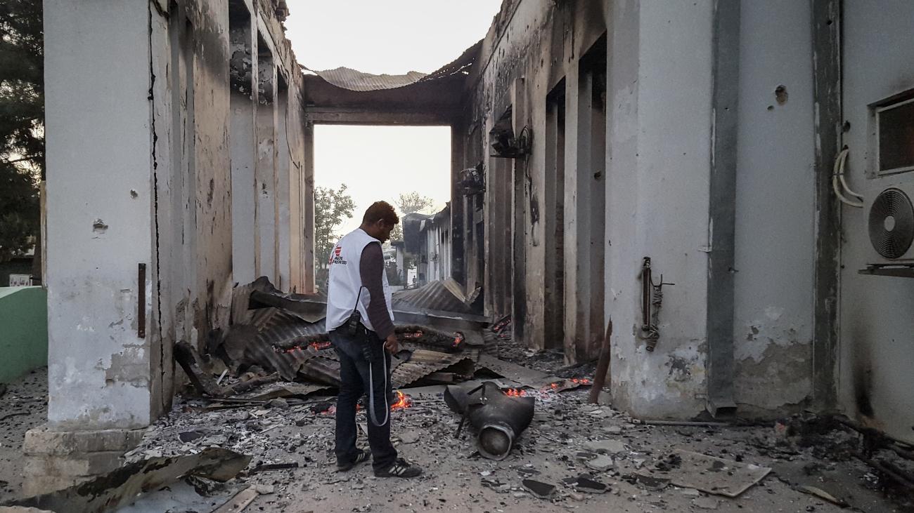 Un membre du personnel MSF à travers les ruines du centre de traumatologie, quelques heures après le bombardement, le 3 octobre 2015.