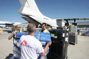Après le passage en douane, tout le matériel a été transféré dans les entrepôts MSF de la ville.