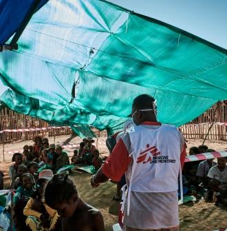 Les équipes MSF dépistent et prennent en charge les personnes souffrant de malnutrition aiguë à travers des cliniques mobiles dans le district d’Amboasary. Elles ont dépisté plus de 12 000 personnes et constaté qu’en moyenne 28 % des enfants de moins de 5 ans étaient atteints d’une forme aiguë de malnutrition. Distributions de jerricans, réparations des pompes manuelles, traitement et transport de l’eau de rivière font partie des activités en cours pour améliorer l’accès à une eau potable. MSF se mobilise également pour pouvoir rapidement procéder à des distributions alimentaires et renforcer la prise en charge hospitalière des patients souffrant de malnutrition aiguë sévère et de complications associées.