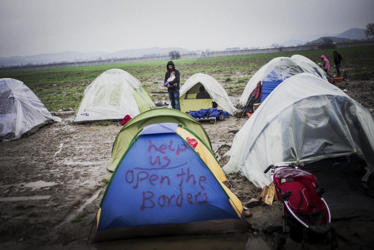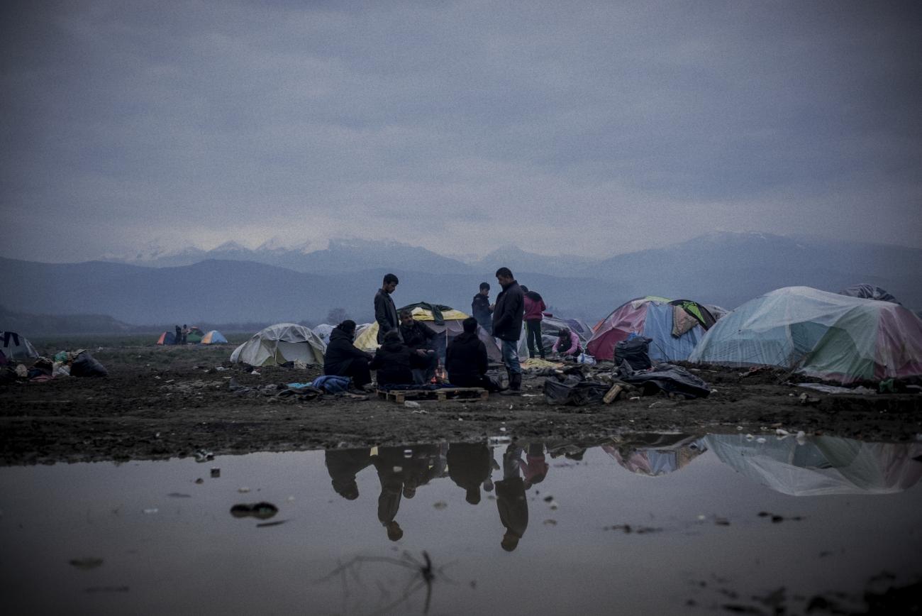 Idomeni, frontière entre la Grèce et la Macédoine. 12 000 migrants sont massés depuis la fermeture de la frontière, en attente d'un accord entre l'Europe et la Turquie (entré en vigueur le 20 mars 2016).