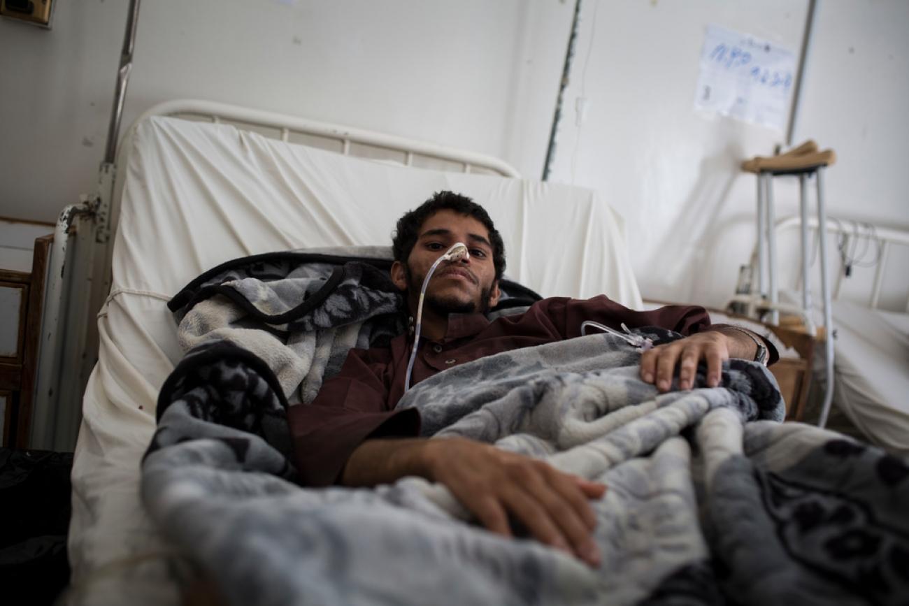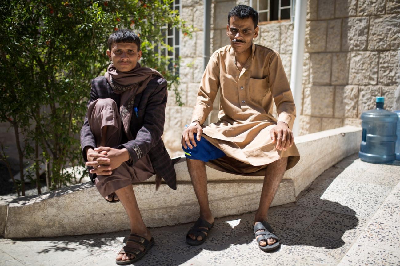 Yousef et Abdulmarid prennent le soleil devant le département de chirurgie de l’hôpital Al Salam. L’aîné, Abdulmarid, a été blessé il y a une quinzaine de jours par une grenade. Suite à sa blessure, son frère l’a conduit au centre de soin le plus proche à Al Qafla, une structure soutenue par MSF. L’équipe sur place n’était pas en mesure de l’opérer et l’a référé à l’hôpital de Khamir.