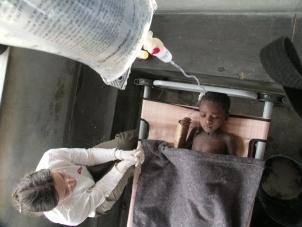 Nous transportions le matériel nécessaire : des seaux, du chlore, des ustensiles de nettoyage, des vêtements de protection et bien sûr le matériel médical (solution de réhydratation, sels de réhydration, intraveineuses, antibiotiques, ect.) ».