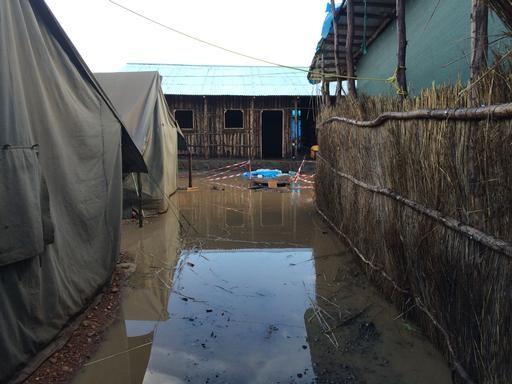 Lors du dernier orage, le 24 août, des abris se sont envolés. La base MSF a été inondée, le vent a déchiré la bâche en plastique recouvrant le toit de la tente. Il a fallu reloger le personnel sous d’autres tentes. De plus, les latrines du camp, construites à la hâte, sont pleines d’eau ou se sont effondrées, elles débordent.