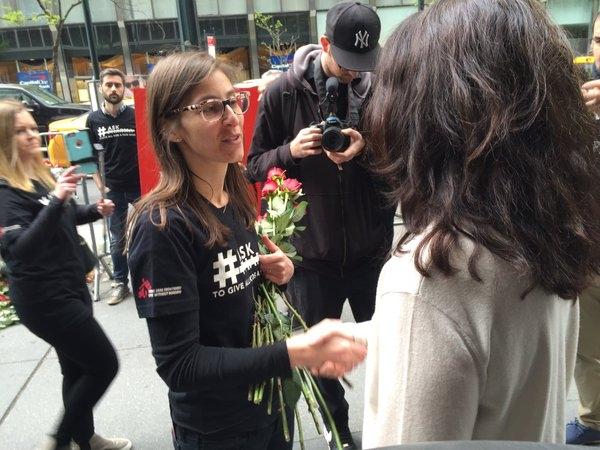 MSF a remis les signatures récoltées par la pétition A Fair Shot /L’injuste prix au cours d’un sit-in devant le siège de Pfizer, à New York. 2 500 fleurs ont été déposées à l’entrée du bureau, une pour chaque enfant qui décède d’une pneumonie tous les jours. Les noms des près de 400 000 signataires de la pétition, en provenance de 170 pays, ont été imprimés et déposés dans un berceau vide.