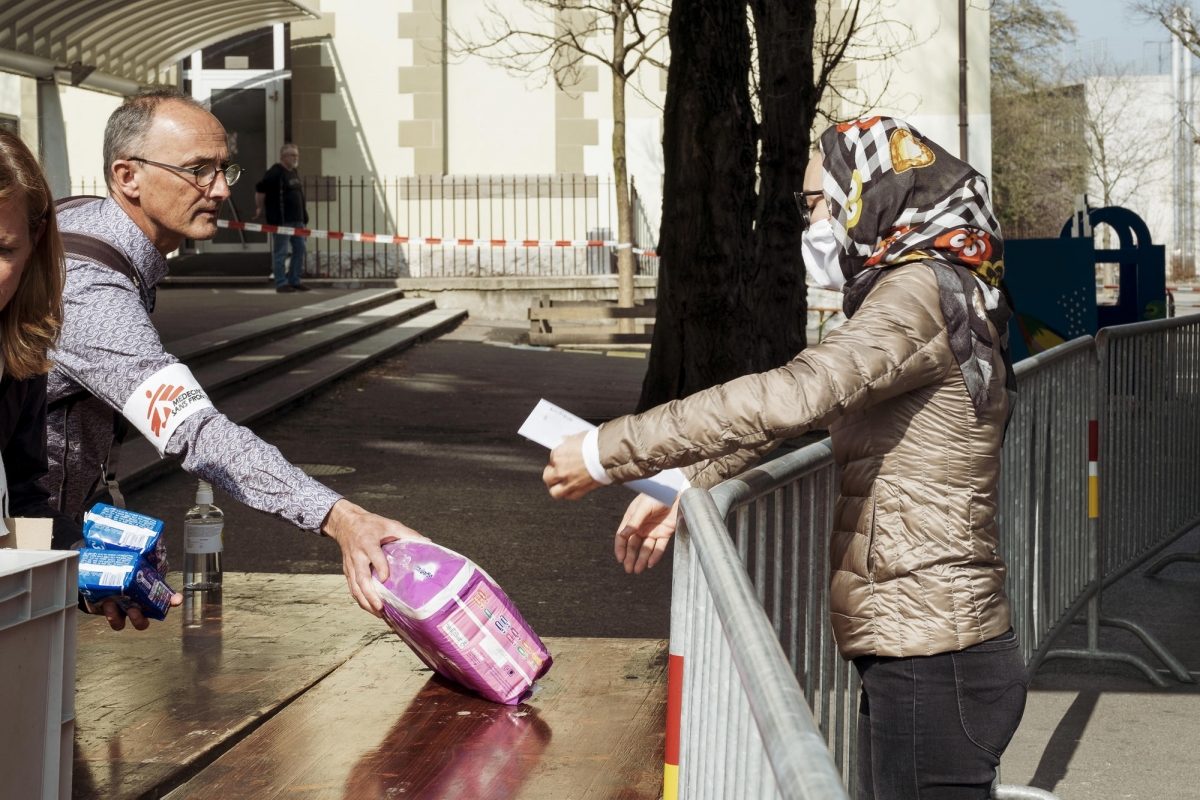 À Genève, MSF fournit un support logistique aux associations et aux services de la ville pour aider les groupes vulnérables dont les personnes vivant à la rue. Les équipes dispensent aussi des formations aux volontaires mobilisés dans les lieux d’accueil, et qui assurent la distribution de produits de première nécessité et coupons de nourriture.