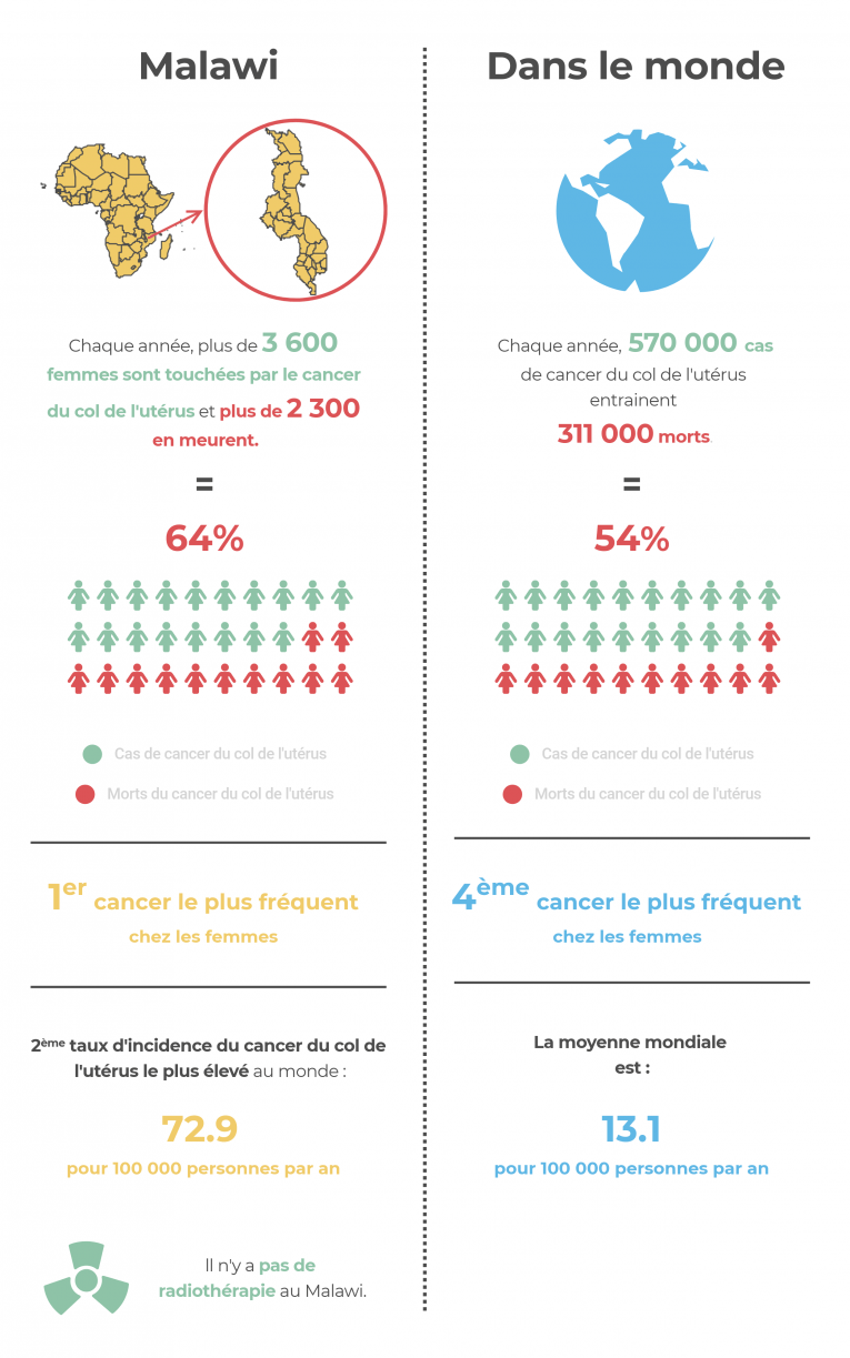 Les équipes sur place constatent que dans 80 à 90 % des cas de cancers du sein et du col de l'utérus, les femmes se présentent à l'hôpital à des stades avancés de la maladie – cancers de stade 3 ou 4 –, pour lesquels les chances de guérison sont très limitées. Or une sensibilisation et une prévention précoce, notamment grâce à la vaccination contre le papillomavirus humain dans le cas du cancer du col de l'utérus, réduirait largement le risque que des lésions précancéreuses et cancéreuses ne se développent.