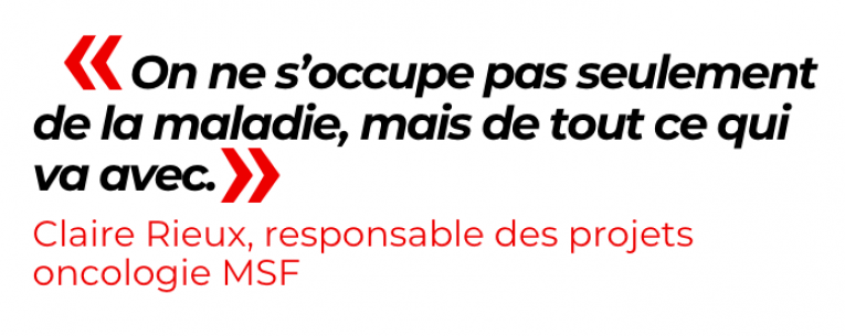 Pour les patients atteints d'un cancer de stade 3 ou 4, il existe peu, voire pas d'option thérapeutique. L'urgence médicale de la prise en charge de la douleur a été un élément clé dans la mise en place des deux programmes d'oncologie de MSF, au Mali et au Malawi. Les soins palliatifs visent ainsi à améliorer le confort des patients, de soulager leurs douleurs ainsi que d'appréhender la fin de vie dignement. Les équipes MSF fournissent des soins palliatifs à l'hôpital, mais également directement à domicile afin d'épargner aux patients, déjà affaiblis par leur cancer, des déplacements. Cela permet également d'apporter un soutien psychosocial aux patients et à leurs familles.
