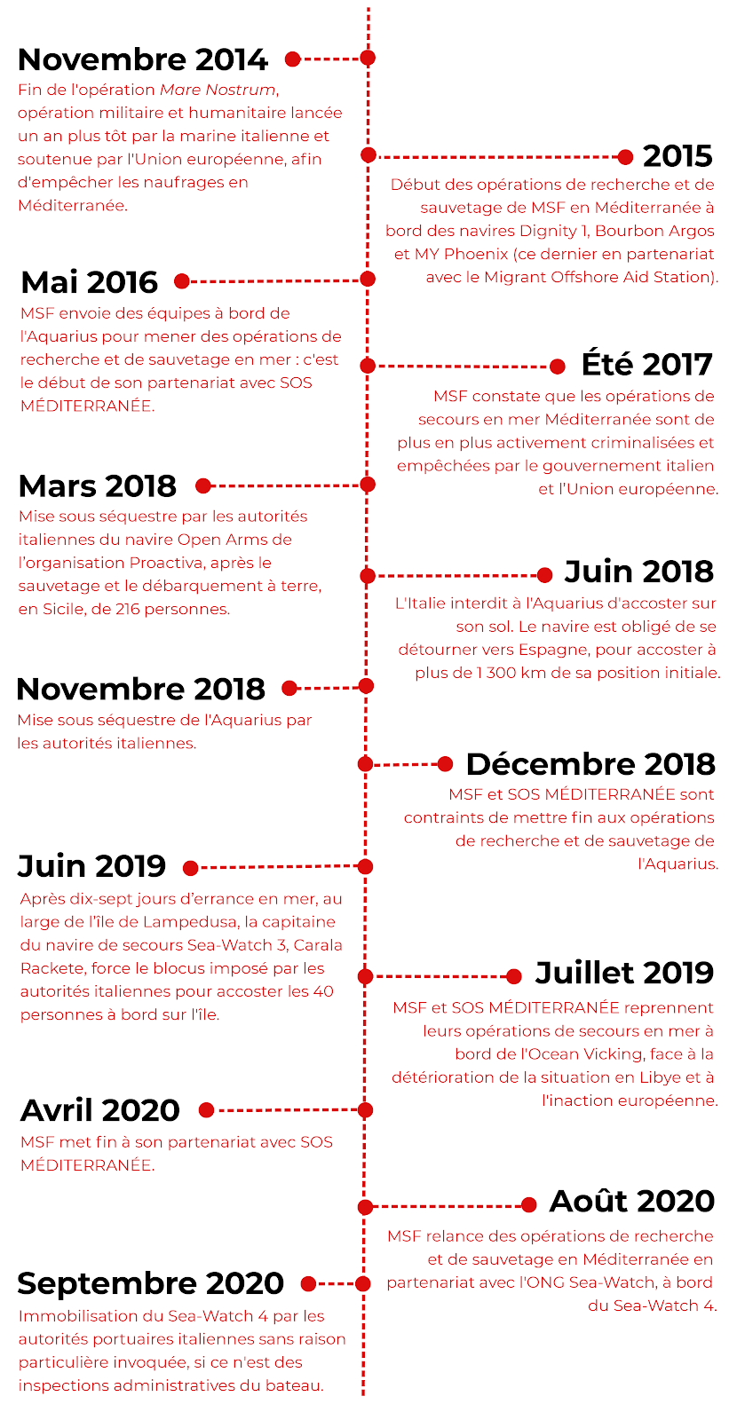 Depuis plusieurs années, les équipes MSF présentes sur les bateaux de sauvetage en Méditerranée centrale pour dispenser des soins aux personnes qui risquent leur vie en tentant de la traverser, sont témoins d'une succession de naufrages et de l'inaction de l'Union européenne pour leur venir en aide. Hommes, femmes et enfants se noient dans l'indifférence quasi-générale des États européens qui entravent les opérations de recherche et de sauvetage.