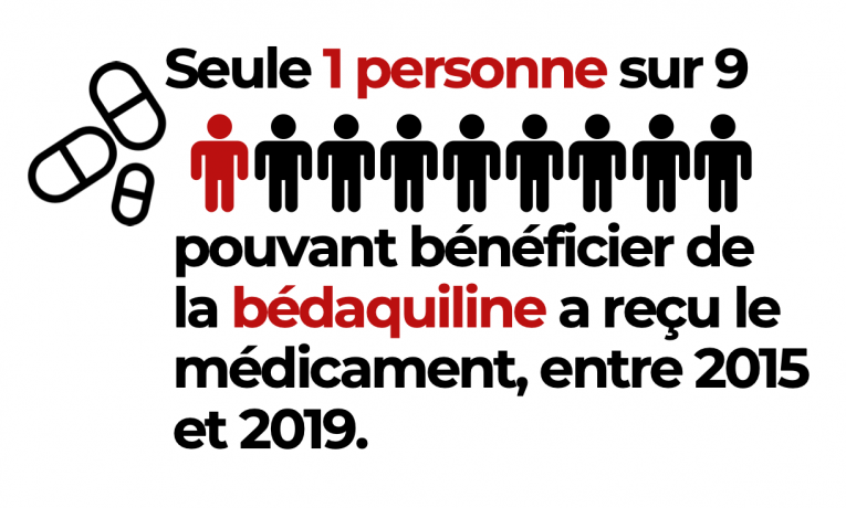 Encore utilisé dans de nombreux pays, le traitement plus ancien de la tuberculose multirésistante impose aux patients de prendre jusqu’à 14 000 comprimés sur près de deux ans et d’endurer jusqu’à huit mois d’injections journalières douloureuses. Les gouvernements doivent donc généraliser l'accès à la bédaquiline. Le laboratoire Johnson&Johnson est actuellement le seul fabricant de bédaquiline, brevetée dans la plupart des pays. Il contrôle, par conséquent, le prix de vente. Ce monopole empêche d’autres fabricants, comme l'Inde, de produire et commercialiser des versions génériques moins coûteuses. En 2020, le géant pharmaceutique a annoncé la baisse du prix de la bédaquiline à 1,50$ USD par jour. Mais cela n'est toujours pas suffisant : MSF a enjoint Johnson&Johnson de procéder à une baisse supplémentaire et d’offrir le prix réduit à tous les pays confrontés à une forte incidence de tuberculose multirésistante, afin de sauver davantage de vies.