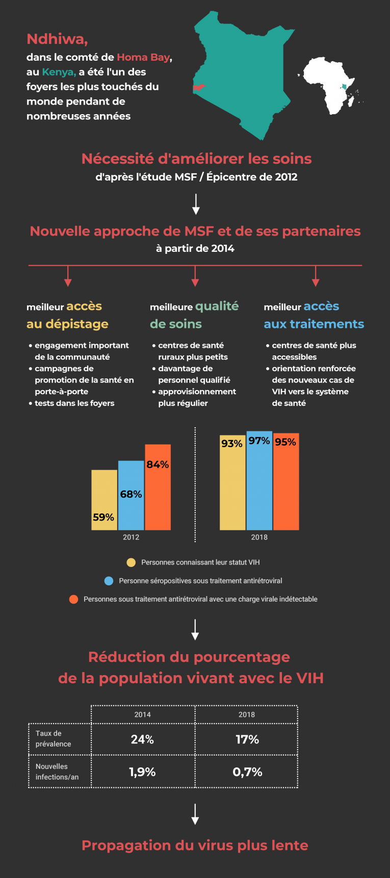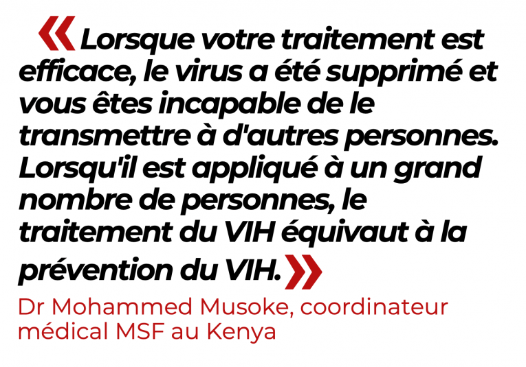 Dans son projet à Ndhiwaau Kenya, l'un des foyers de VIH les plus importants au monde, MSF a amélioré la prise en charge des patients en adoptant, dès 2014, l'approche dite du « traitement comme prévention ». Elle comprend plusieurs axes d'interventions complémentaires :