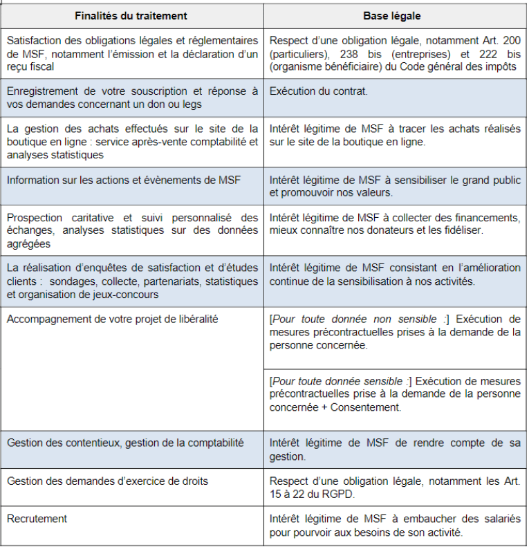 Le tableau ci-dessous regroupe l’ensemble des finalités et bases légales des traitements de données personnelles effectués par MSF.