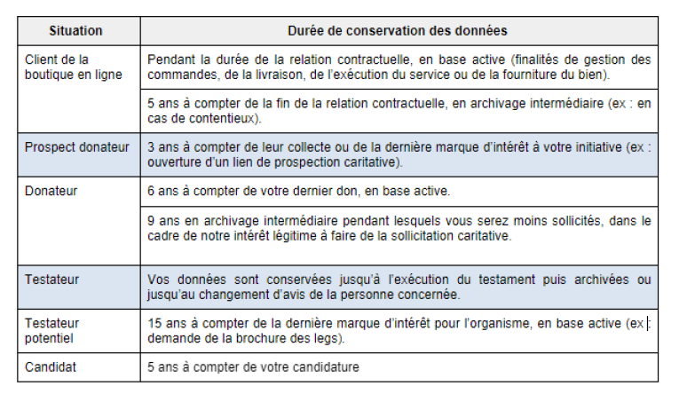 Dans certains cas, une durée de conservation plus longue nous est imposée par une obligation légale. Par exemple, les reçus fiscaux doivent être conservées pour une durée de 6 ans au titre de l’article L. 102 B du livre des procédures fiscales (LPF).